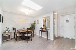 This west-facing unit boasts a spacious and open floor plan. It includes a separate living room and dining room, which provide plenty of space for relaxation and entertainment. The bright open kitchen, enhanced by a skylight, is perfect for those who enjoy cooking. From the living room and balcony, enjoy partial views of downtown Vancouver and the water. This creates a serene atmosphere where you can unwind after a long day.