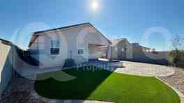 The primary suite showcases a walk-in closet and ensuite bath with dual sinks and step in shower. With centralized Ac unit for year round comfort. Parking is easy with 2 car garage and generously spaced driveway. Step around to the backyard through side gate with wheelchair accessible walkway, paved to rear of the home. Opening up to a fully landscaped backyard, complemented by spacious Patio, Fire Pit and Luxury Turf and Green. The property sits on a premium lot with a wonderful panoramic Maricopa view. Additionally, the residents benefit from the newly developed entertainment facilities, which include a community pool, pickleball and sand volleyball courts, shaded play structures and ramadas, fire pit, great lawn, walking trails, green belts, tot lot, yard games and more. Multiple golf courses and Casino located nearby. Nestled in a prime Maricopa location, this home is conveniently located to schools, parks, dining, shopping and entertainment, offering an ideal combination of lifestyle and convenience.