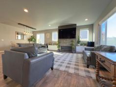 • The main floor showcases an open-concept layout with rich wood-style plank flooring and a stone-front fireplace.