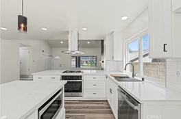 Exuding elegance and modern design, this fully remodeled 4 bed 2 bath 1,750 sq ft residence showcases an inviting open concept layout that seamlessly connects the living room to the chef's kitchen. Upon entry you are greeted by soaring cathedral ceilings and a dramatic floor to ceiling black shiplap fireplace with a rustic wood mantel and sleek electric insert, setting the stage for the home's sophistication. The kitchen offers an abundance of counter space with a large breakfast bar perfect for gatherings, along with quartz countertops, subway tile backsplash, stainless steel appliances, a microwave conveniently placed in the island, and dual pendant lights accenting the designer vent hood and cabinetry. A central flex space with built in desk complements three spacious bedrooms and a guest bath with chic black fixtures, tiled tub shower, and glass enclosure. The expansive primary suite offers abundant natural light, a massive walk in closet, and a spa inspired bath with dual sinks, frameless glass shower, and decorative flooring. With newer roof, plumbing, electrical, dual pane Milgard windows, fresh white exterior paint with black trim and red door, lush newer sod in the front and backyard, a two car garage, and a private backyard with shade bar patio cover, this home combines style and comfort in a prime location near award winning schools, shops, restaurants, and the new Sand Canyon Village all with no HOA and no Mello Roos just off the 14 freeway.