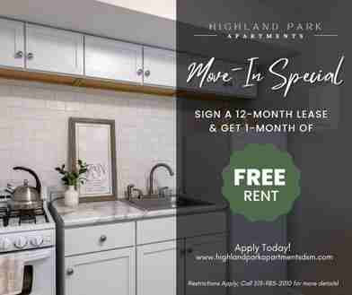 Welcome to Highland Park Apartments! Discover our freshly renovated deluxe 1-bedroom, 1-bathroom units exuding a cozy ambiance complete with full kitchens, ample storage, and abundant natural light. Situated conveniently off E. 14th Street, merely 2 miles from I-80/I-35, Highland Park Apartments offer unrivaled accessibility. Enjoy proximity to local grocery stores, eateries, and gas stations within walking distance. With a DART bus stop just one block away, commuting is a breeze. Families, college students, and retirees alike will appreciate our location near Madison Elementary (0.3 mi), Harding Middle School (1 mi), North High School (2.1 mi), Grand View University (1 mi), DMACC Urban Campus (3.6 mi), and Drake University (4.7 mi), making us an ideal community hub. Ready to make Highland Park Apartments your new home? Click "Apply Now" to begin your application process! Pets are warmly welcomed without breed restrictions, with a one-time non-refundable deposit and monthly pet rent. Residents are responsible for setting up electric utilities in their name. Our screening criteria include a household gross monthly income at least 2.5 times the rent, a minimum credit score of 525, a clean criminal history, and a positive rental history. Have questions? Contact our dedicated staff at 515-218-9398. We're committed to helping you find your forever home!
