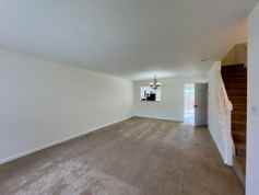 The spacious living area features wall-to-wall carpeting, neutral tones, and a large bay window that fills the room with natural light. The open layout connects effortlessly to the dining area, accented by a ceiling fan, making it a great spot for gatherings or quiet family meals.