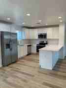 Quartz countertops and soft closing cabinets in kitchen and bathroom
