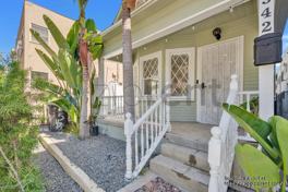 Welcome to 542 Magnolia Ave, a charming residence nestled in the heart of Long Beach, CA. This beautifully updated home boasts a welcoming exterior with lush greenery and a quaint front porch, perfect for enjoying the vibrant neighborhood. The interior is a blend of modern amenities and classic charm, featuring an open-concept living space with sleek hardwood floors and ample natural light. The kitchen is a standout, equipped with contemporary black cabinetry, marble countertops, and a striking red refrigerator that adds a pop of color and style.