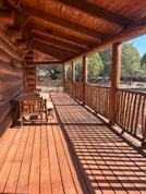 A gracious wraparound porch spans three sides of the cabin, offering breathtaking views to the south, east, and west. The interior is tastefully curated with the artwork and design sensibility of Chaille Trevor, one of the property's owners, adding a unique and personal touch to this inviting mountain escape.