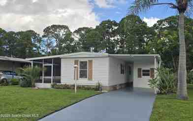Welcome to your new home! 2 bedrooms and 2 Full bath, freshly painted, single wide in Barefoot bay FL.,with a formal living room which adjoins an open concept kitchen. Spacious screened in porch on the west side. Covered driveway and adjoined laundry room. Freshly painted interior. New screened porch. A/C is only 4yr old. Includes Lawn maintenance and Pest Control. Washer dryer hookups in attached Laundry room, washer and dryer not included. Tenant may use pool and amenities BY PURCHASING HOA MEMBERSHIP - VOLUNTARY ($520.02 Annually for adults or $68.48PM additional $37.45 Annually for Minors ). 18 Hole golf course, 3 pools, tennis courts, boccie ball, shuffle board, and more activities available in clubhouse. Beautiful dock on Indian River Lagoon access. Easy access to grocery store,post office, library, pizza restaurant and bank. Move in requires 1st, last, security dep. $4650.00. Property Manager . Please use rentspree link to apply