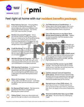 At Pmi, we strive to provide an experience that is cost-effective and convenient. That’s why we provide a Resident Benefits Package (rbp) to address common headaches for our residents. Our program handles insurance, pest control, air filter changes, utility set up, credit building, resident rewards, identity protection and more at a rate of $69.99/month, added to every property as a required program. More details upon application.