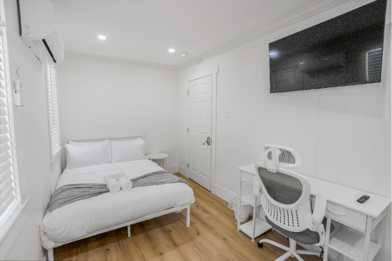 Private furnished room with double bed, Smart TV, desk, chair, and closet space.