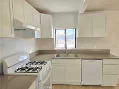 -New kitchen with shaker-style cabinets, sleek gray quartz countertops, and matching new gas stove and dishwasher