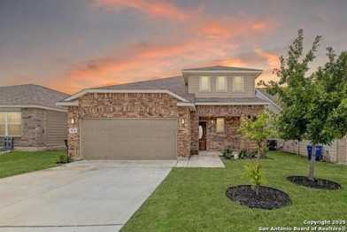 Tucked into an established neighborhood in close proximity to Randolph AFB, this beautifully appointed home offers a spacious layout designed for both comfort and function. High ceilings and an open-concept design create a bright, airy feel throughout the main living areas. The kitchen features sleek granite countertops, 42" upper cabinets, and a coordinating tile backsplash, flowing into the dining and family room for a seamless layout. The primary suite is located on the first floor and includes a full bath with a soaking tub and separate shower. Upstairs, two generously sized secondary bedrooms share access to a large media room that can serve as a game room, second living area, or home theater. Outside, you'll find a covered patio and a spacious backyard. Additional upgrades include all-new lighting throughout the home and a finished garage with polyurea flooring, insulation, and air conditioning. Conveniently located near Randolph Air Force Base, with easy access to Loop 1604, I10, FM 78, and a variety of shopping, dining, and schools in the Converse area, this home offers a balanced combination of comfort and accessibility.