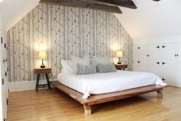 The upper level features a dramatic master loft with soaring peaked ceilings, exposed beams, a king Tempur-Pedic bed, fireplace, and spa-inspired ensuite with heated floors and a rain shower. A second queen bedroom and full bath complete the space.