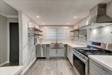 Updated kitchen with stainless steel appliances, ample storage with renovated cabinets and an island/bar setup with seamless connection to the living area, creating a spacious, airy feel.