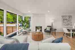 The main level offers an airy, open layout that connects the living, dining, and kitchen spaces — perfect for both everyday living and entertaining. The living room, wrapped in windows, bathes in natural light and centers around a striking tiled gas fireplace. The adjoining dining area opens onto a sunny deck, ideal for morning coffee or al fresco dining. The inspired kitchen shines with crisp quartz countertops, stainless steel appliances, and sleek cabinetry. Three generous bedrooms and an elegant bathroom with a walk-in shower complete this level.