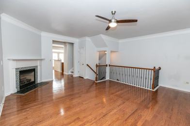 On the second floor, an open plan brings together a spacious living room, a large dining area, and a well-appointed kitchen. The kitchen features wood cabinetry, a pantry, stainless steel appliances, a large refrigerator/freezer, gas cooktop, granite countertops, and a new faucet. The dining room sits adjacent to the kitchen, making hosting easy and natural.