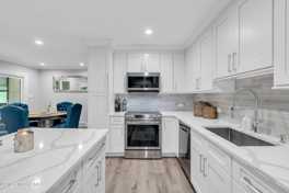 Absolutely stunning 2 bed 1.5 bath condo will wow you from the moment you walk in! Enjoy an open concept layout w/gorgeous newer flooring, a renovated kitchen featuring quartz countertops, beautiful tile backsplash, stainless appliances & center island. An abundance of recessed lighting, both baths tastefully renovated & full sized front loading washer & dryer. Enclosed sun room. Set in a peaceful, tree-backed location for added privacy and best of all enjoy the added peace and quiet of no upstairs noise to worry about! This 55+ community offers club house, activities and a wonderful location close to shopping, restaurants & transportation. Come take a peek, you will not be disappointed!!