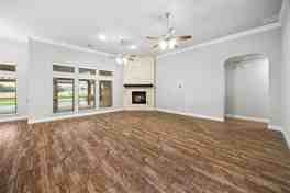 The open-concept living space is anchored by luxurious wood-look tile and a chef’s kitchen featuring an 11-foot island, granite countertops, stainless steel appliances, and generous cabinetry—perfect for entertaining or everyday family life.