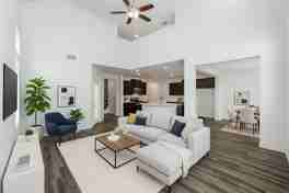 floor plan with soaring high ceilings in the living that opens up from the kitchen with a nice sized curved island and