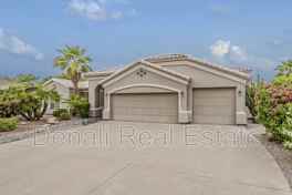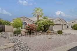 No Application Fees! Absolutely stunning 5 bedroom, 3 bathroom single-level home situated in the prestigious gated golf community of Alta Mesa Estates. This beautifully appointed home offers elegant living spaces with wood plank-style tile flooring throughout the main areas, new plush carpeting in bedrooms, two-tone neutral paint, plantation shutters, and upgraded fixtures and ceiling fans. Enjoy multiple entertaining spaces including a large front living room with fireplace, formal dining room, and separate family room. The chefs kitchen is a showpiece with quartz countertops and backsplash, upgraded cabinetry, extended counter and storage space, breakfast bar, walk-in pantry, casual dining nook overlooking the backyard, and stainless-steel appliances. The expansive primary suite features a dual-sided fireplace, vaulted ceiling, luxurious bathroom with quartz-topped dual vanities, jetted tub, large walk-in shower, and oversized walk-in closet. Additional highlights include a spacious laundry room with washing machine and dryer, utility sink, and storage cabinets, plus a three-car garage offering ample parking and storage. The backyard is designed for relaxation and entertaining with a large covered patio, mature fruit trees, and lush landscaping throughout the property.
