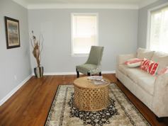 Family room off the kitchen with a ceiling fan, laminate floors (hardwood look), and double doors leading to the back deck. 2 of the 3 bedrooms are located on the first floor each with a ceiling fan, closet, and hardwood floors.