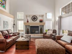 Two distinct living areas: Formal living room with wood floors, vaulted ceilings, and fireplace . Step-down family room off the kitchen for casual gatherings. Backyard with play pool (not heated), built-in BBQ, and bar area. 2-car garage, RV gate.