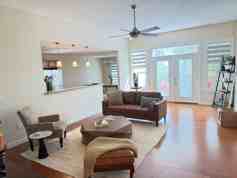 The kitchen is equipped with granite countertops, stainless steel appliances, and ample storage, while additional highlights include wood floors, a dedicated laundry room with washer and dryer provided as a courtesy, and numerous closets throughout the home.