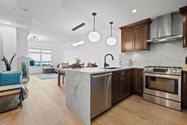 Inside, the open-concept living area is enhanced by 9-foot ceilings, rich hardwood floors, and high-end furnishings throughout. The space flows seamlessly into the chef-inspired kitchen, featuring quartz countertops, premium stainless-steel appliances, and sleek cabinetry, perfect for both casual meals and stylish entertaining.