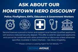 Second Avenue is proud to offer the Hometown Hero Leasing Discount Program to honor and support local heroes, including police officers, firefighters, emergency medical personnel, educators, and government employees. Eligible participants who are fully approved for a lease will enjoy a reduced security deposit on their Second Avenue home. This offer cannot be combined with other promotions or discounts unless otherwise specified. Available in Select Markets - Ask About Eligibility.