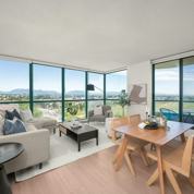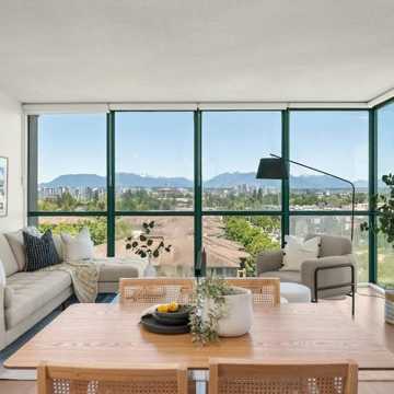 Wake up to sweeping mountain and farmland views! This bright 750 sq. ft. 1-bedroom corner suite on the 10th floor at Centre Pointe features 9' ceilings, new wood floors, fresh paint, new blinds, and a private balcony with 180° views of the North Shore mountains, farmland reserve, and city lights.