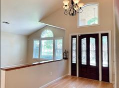 large home Square Feet 2,433, Formal Living room and Formal Dining room, with Living room with Fireplace, Dining room off Kitchen, 1/2 Bathroom Downstairs by Laundry room, large open kitchen Lots of Cabinets with Bar, Built in microwave, Electric Stove top with Double ovens, Dishwasher. In Door Laundry Room with sink and cabinets, Chandeliers and Ceiling fans, Master Bedroom located Downstairs, His and Her sinks, Tub and walk in Shower, Walk in Closet with built in Shelves and Mirror Doors, French doors leading to Backyard off Master bedroom. Faux Blinds, French doors in Dining room and off Living room that have Blinds inside the Glass, 3 Bedrooms and 1 Bathroom located upstairs, Landscaped front and Back yard, Owner supplies Outside Tables\Chairs, Garage has Utility Storage cabinets and Workbench. Pets negotiable