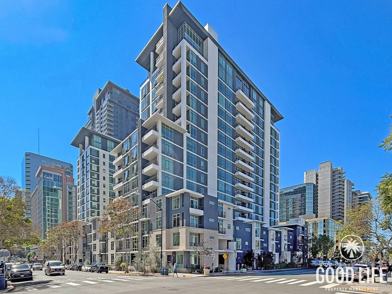 Welcome to this bright and spacious 2-bedroom, 1-bath home in the Aqua Vista building in Downtown, San Diego. Offering 877 sq. ft. of light-filled living space, the open layout and large windows create an airy, inviting atmosphere throughout the home. The kitchen features sleek stainless steel appliances and flows seamlessly into the living area, complete with a built-in entertainment center—perfect for relaxing or hosting. The primary bedroom includes a walk-in closet, while the spacious bathroom adds comfort to everyday routines. An in-unit washer and dryer and central A/C & heat provide convenience and year-round comfort. Residents enjoy resort-style amenities including a pool, spa, fitness center, concierge service, and valet parking, all just minutes from the restaurants, cafés, and waterfront attractions of downtown San Diego.