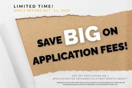 **New! 50% OFF application fees through October 31st! **New! 100% Application Fee REFUND to new residents, credited toward your first month's rent. Must apply by October 31st.**