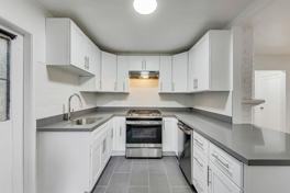 -- Fully remodeled and modern kitchen with new quartz countertops, cabinetry, and stainless steel appliances, including a spacious refrigerator, gas range, and dishwasher.