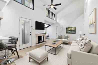 Step inside to discover a spacious living area centered around a cozy fireplace, perfect for relaxing or entertaining. The updated kitchen features modern finishes and flows effortlessly into the dining and living spaces. A dedicated office area with large windows provides an ideal environment for working from home or creative projects.