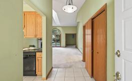 The kitchen is bright and welcoming, featuring a breakfast bar, informal dining area, and a large window that fills the space with natural light. The vaulted living room is highlighted by a skylight and a cozy gas fireplace, perfect for relaxing evenings. From here, a patio door opens to your own private patioan ideal spot to enjoy morning coffee or quiet afternoons.
