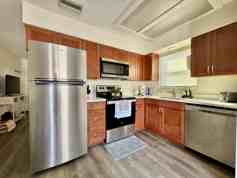 The updated kitchen includes quartz countertops and stainless steel appliances, blending style and functionality. The home also offers high-speed internet, comfortable beds, and quality furnishings throughout.
