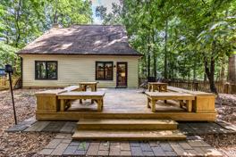 * The large fenced back yard features a large deck with seating.