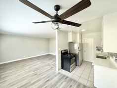 Enjoy hardwood-style flooring, a large living area perfect for relaxing or entertaining, and a well-sized bedroom with ample closet space. The kitchen features lots of cabinet storage and room for a small dining setup, creating a comfortable and functional living space.