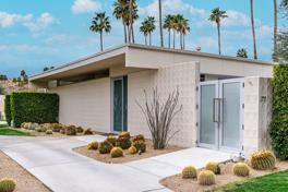 Stunning and sophisticated mid-century modern home in South Palm Springs. Timeless design with modern comforts, featuring sleek quartz countertops, stainless-steel appliances, and polished concrete floors throughout. Walls of glass and 10-ft ceilings capture breathtaking mountain views. Enjoy a cozy double-sided fireplace, remote shades, and updated spa-like baths. Located in the iconic Seven Lakes Country Club with golf, 15 pools, spas, and a clubhouse with restaurant and bar.