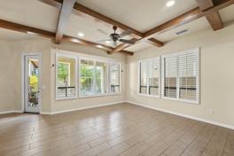 This stunning home offers an open and spacious floor plan with beautiful wood beam ceilings that add warmth and character. The chef's kitchen features a cooktop island, large walk-in pantry, and plenty of space for entertaining. Enjoy fresh new paint, elegant shutters throughout, and a convenient washer and dryer included. The primary suite boasts a private balcony overlooking the backyard; the perfect spot for morning coffee or evening relaxation. Located in a fantastic community offering a resort-style pool, gym, and parks. Just minutes from Rancho Mirage shopping and dining - but with the value of a Cathedral City address! Experience the best of both worlds in this beautifully maintained home.