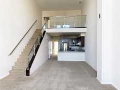 The main level features a spacious open-concept living and dining area with high ceilings and large windows that fill the home with natural light. The kitchen offers modern appliances, sleek countertops, and storage.