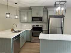 Beautifully renovated townhome is dripping with elegance and taste! The open concept design features a fully remodeled kitchen with all new cabinetry (soft close drawers and doors), a built-in Lazy Susan and new solid surface countertops. Matching appliances and a free-standing island give the home cook a lot of work and entertaining space!