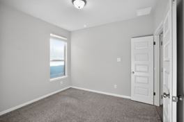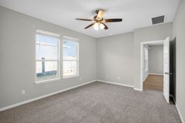 Welcome to this immaculate, modern 4-bedroom, 2-bathroom home. The attractive navy-blue exterior with white stone accents and a two-car garage provides fantastic curb appeal. Inside, you'll find a bright, open floor plan featuring stylish wood-look tile floors throughout the main areas. The stunning kitchen boasts white shaker cabinets, sleek quartz countertops, a spacious island, and a contemporary gray subway tile backsplash and stainless steel appliances complete the modern look. The primary suite offers plush carpet and a spa-like bathroom with dual vanities and a large tiled walk-in shower. Enjoy outdoor living on the covered back patio overlooking the fenced backyard. This move-in ready home combines modern design with functionality. Pets ok; limit two; 50lbs or less.