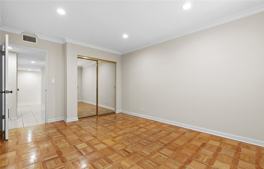 The open living area features classic parquet floors, a marble fireplace, and crown molding. Cook and entertain in the updated kitchen with granite countertops and stainless steel appliances, then unwind on your private balcony surrounded by morning light and evening skyline views.