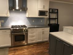 -Chef's kitchen with quartz countertops, Thermador gas range, dishwasher, built-in microwave, and ample cabinet space