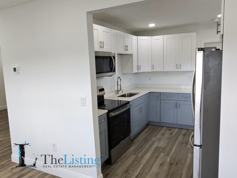 The heart of the home is an appealing kitchen featuring two-tone cabinetry, sparkling white quartz countertops, and a full suite of stainless steel appliances. The bathroom is equally impressive, with chic marble-look tile in the shower area, a glass enclosure, modern black fixtures (including a rainfall showerhead), and a clean vanity with a quartz countertop. The entire interior is finished with easy-to-maintain luxury vinyl plank flooring. Fresh white walls and trim create a clean, airy aesthetic that perfectly amplifies the natural illumination, making every room feel spacious and welcoming.