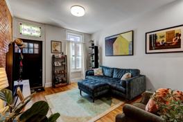 The main level features hardwood floors, recessed lighting, and an exposed brick wall.