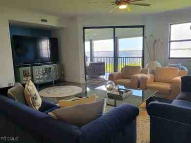 eel the tropical breeze while you relax on this gorgeous spacious lanai. This Florida Feel 6th floor, 3 bedroom, 2 1/2 baths, Palmas Del Sol condo has been fully renovated with high end appointments throughout. Unobstructed north western views over the Caloosahatchee River offer unparalleled sunsets to the West. Luxury designer High-polished French grey wood tile floors throughout, exotic blue diamond and opal white marble countertops, spa master bathroom retreat, custom built-in 42' white shaker cabinets, gourmet chef's kitchen with high-end built-in Kitchen Aid Professional Appliances, and wet bar with wine fridge. Easy walk to the beautiful neighborhood pool! MINIMUM 3 MONTHS - No pets per HOA rules.