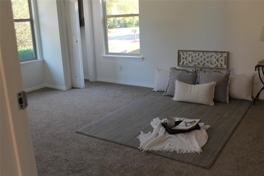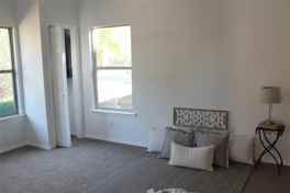 Step into a sunlit living space featuring wood laminate floors, walls of windows, and a seamless transition into the dining and kitchen areas. The kitchen is a designer’s dream—dark gray cabinetry, brushed nickel hardware, open shelving, and a garden window ideal for fresh herbs and morning light.