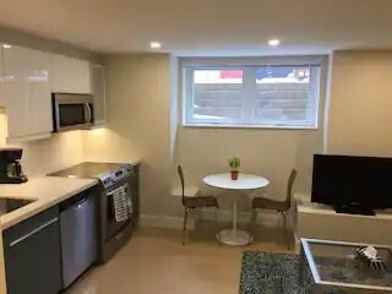 Short term fully furnished renovated apartment in lively Danforth/North Riverdale neighbourhood. The apartment is available starting December 1st and can be rented monthly or for as long as you need it up until May 2026. This is a self-contained renovated one bedroom apartment in a single family home with a separate entrance in a safe and quiet residential neighbourhood with a short walk to everything you need. High ceilings and big windows give the feel that the apartment is not in a basement. The apartment includes a renovated kitchen with quartz countertops and stainless steel appliances, a dishwasher and a microwave. The kitchen is well equipped with small appliances, dishes, pots, pans, and kitchen utensils. There is also a washer and dryer in the apartment. Cable, internet, and utilities are all included. Underfloor heating which is nice on the feet. Short walk to Pape subway station and to the Danforth for shops, restaurants, and pubs.