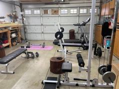 Treadmill and gym equipment located in garage